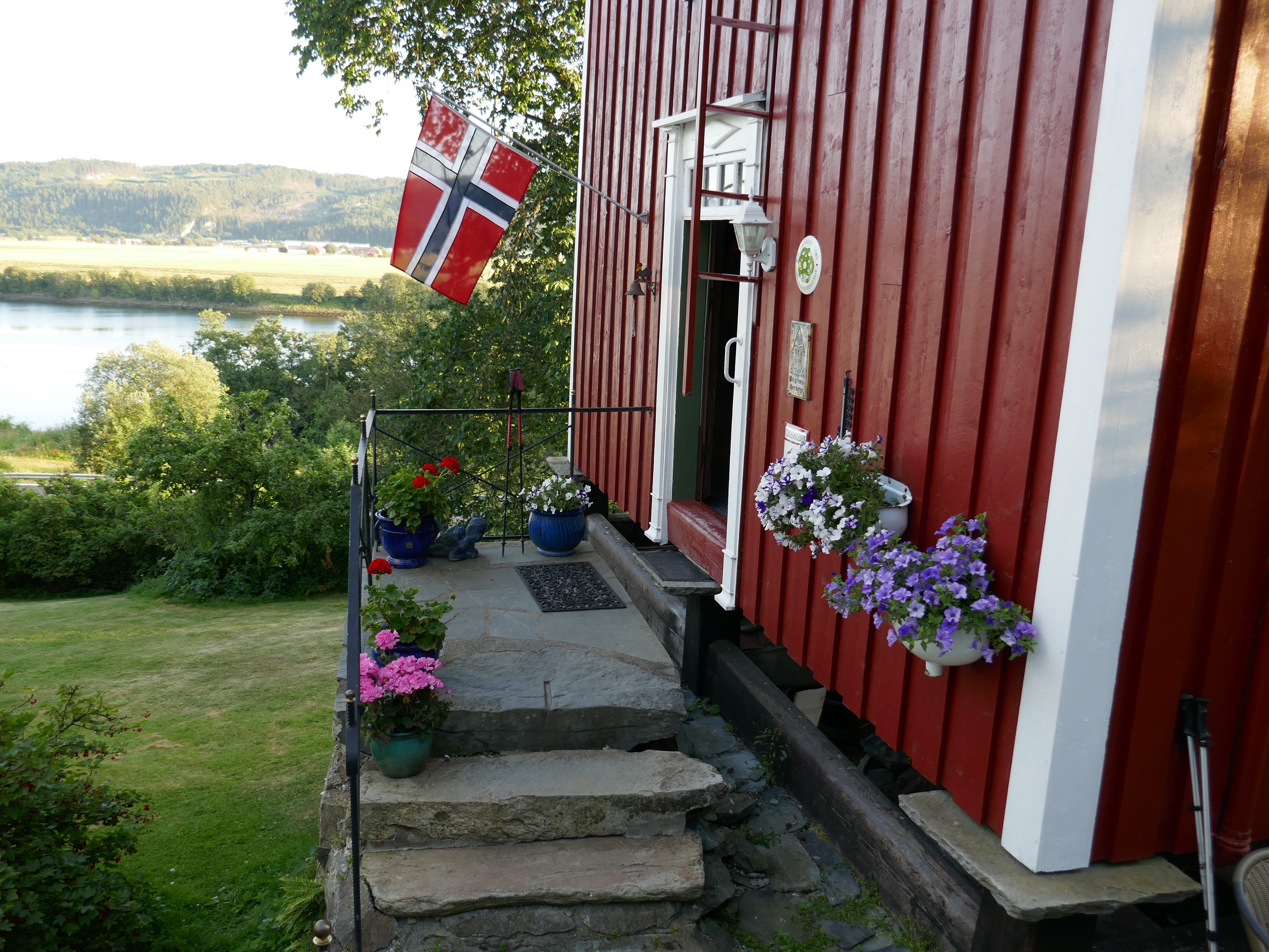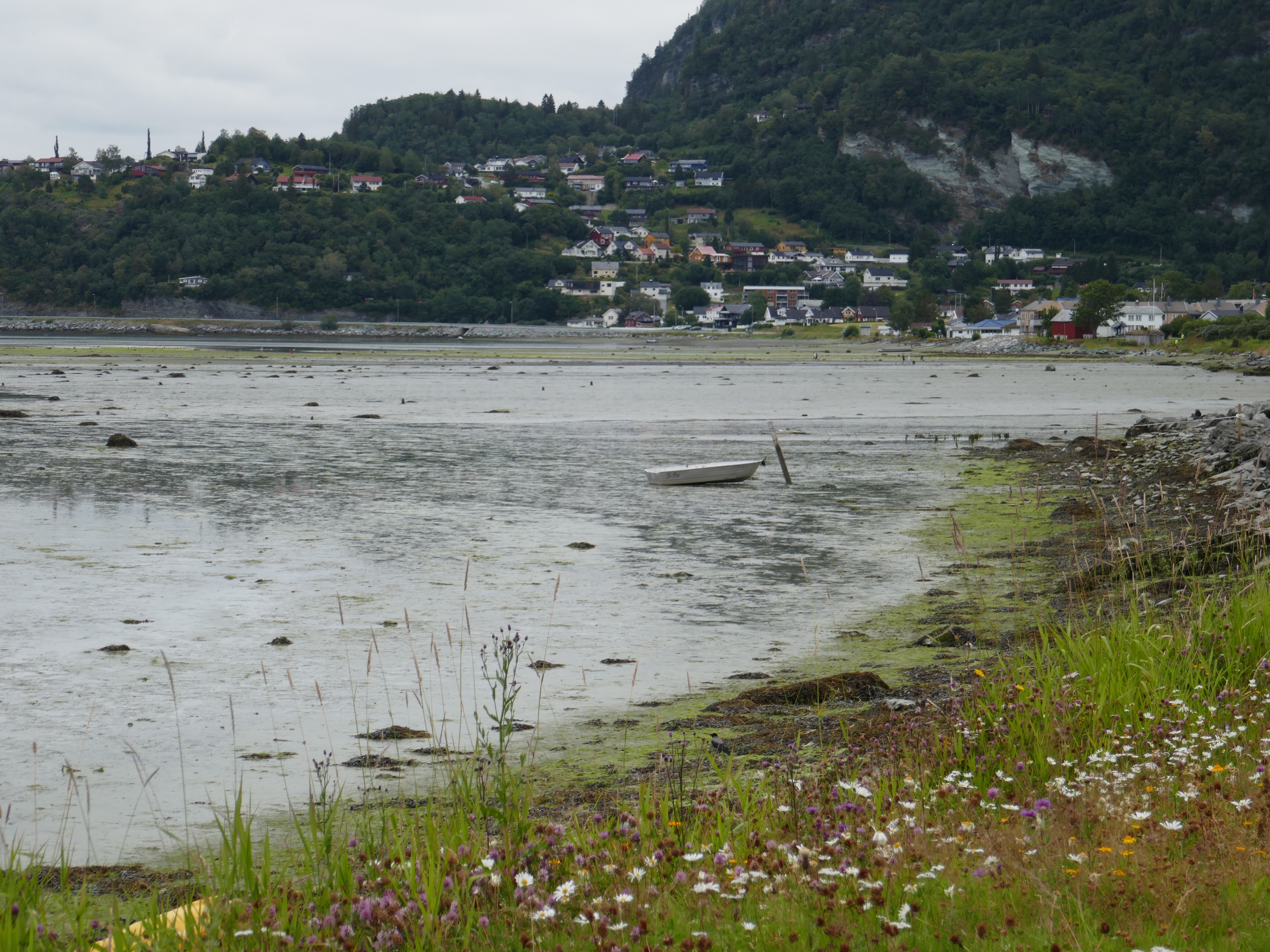 Ausgeschlafen und gut gelaunt mache ich mich um 8:15 Uhr heute auf den Weg. Karl, Katja, sowie Ksenia und ihr Freund sind beim Morgengebet dabei. Greta hat heute Nacht ein wenig gejammert, weil sie allein im Zelt schlafen musste. Ich habe das nicht mitbekommen, aber die anderen, die im Zelt daneben schliefen. Gestern Abend gab es noch eine lange Diskussion ob 400 NOK für eine Hütte ohne Strom und die Fährüberfahrt zu teuer seien. Ich wundere mich und werde in Sundet gård schlafen. Als ich am Wasser ankomme und den Fährmann anrufe, sagt er, dass er gerade in der Stadt sei. Ich sage: „Ich warte“, er sagt „Das kann lange dauern.“ Ich frage: „Wie lange?“ Er sagt bis 15:00 Uhr. Das ist kein Problem für mich, dann mache ich so lange meinen Blog. Er will noch wissen, ob ich dort schlafen möchte und am Essen teilnehmen will. Beides bejahe ich.