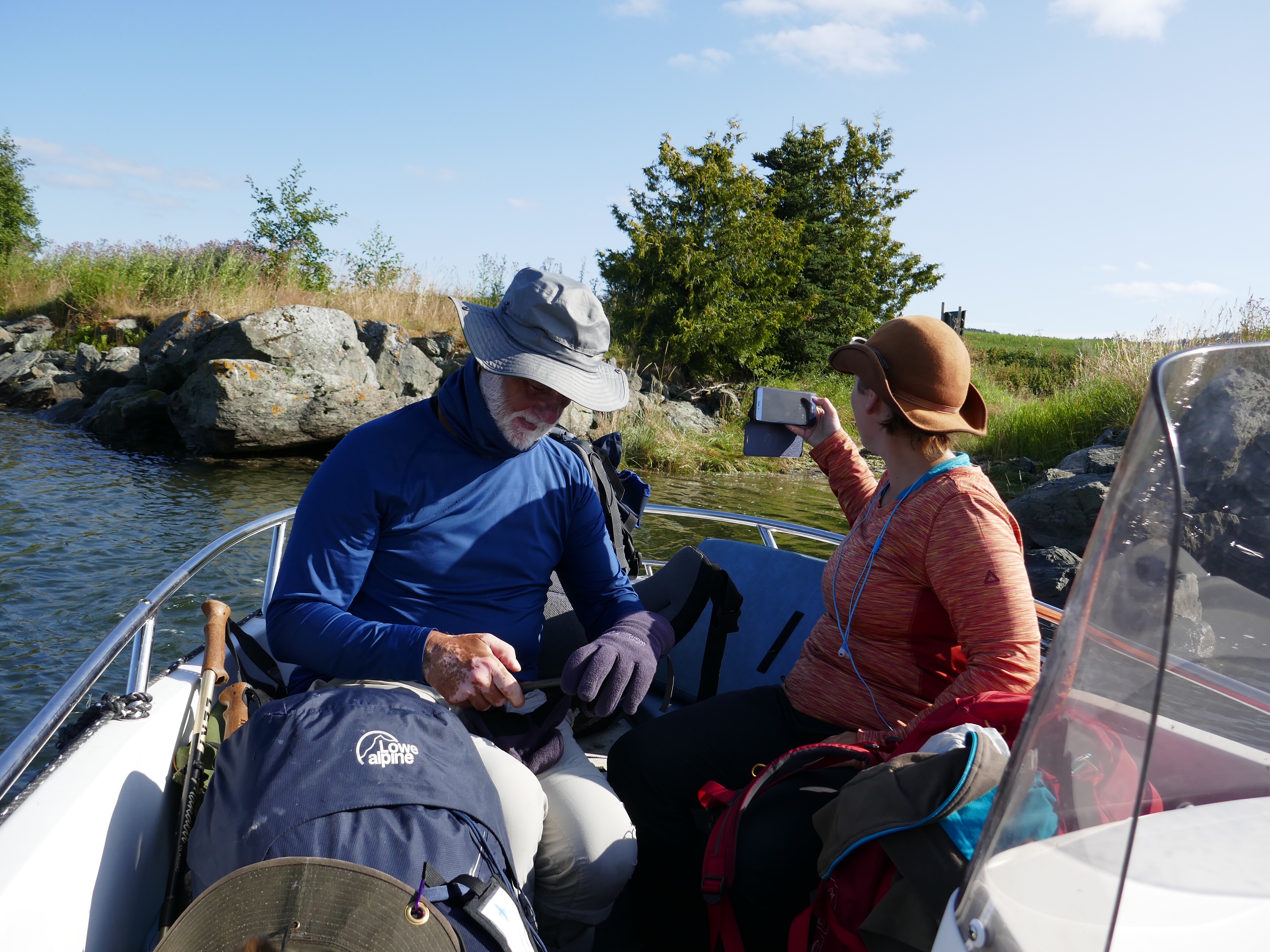 Meinen Rucksack hatte ich unten am Wasser abgestellt. Die Ebbe Bilder fand ich schon in Frankreich immer interessant, jetzt also auch hier. Als Karl kommt, sagt er, dein Rucksack steht im Wasser. Er kam gerade rechtzeitig, 20 cm stand er schon im Wasser, als ich ihn abstellte war das Wasser noch 50 cm tiefer, und: Ich hatte ihn auf einem Stein abgestellt. Das hätte ganz schön nass werden können, jetzt ist nur Zelt und Liegematte tropfnass. Der Fährmann sagt dann noch, dass es 3 Meter Tiedenunterschied sind. Da merkt man halt, dass ich nicht an der Küste aufgewachsen bin, sondern im Alpenvorland.